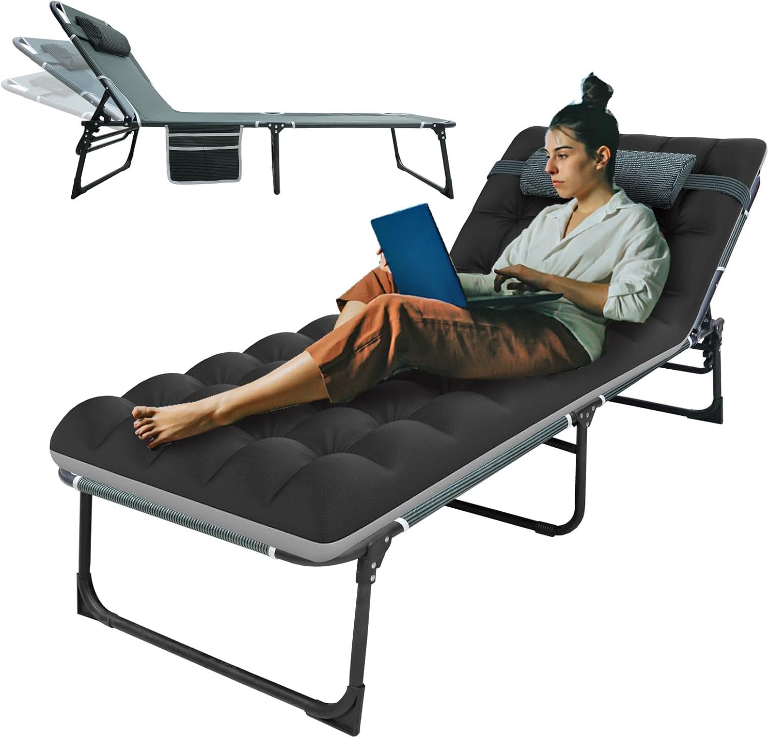 Verifiable product facts: the cot uses a tri-fold design, the listing claims instant setup under minute, and it features an elevated headrest for lounging. Amazon data shows the item listing includes images and description calling out the triangular support system and wider foot pads.
