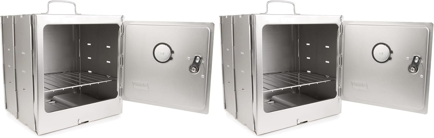 Space-saving fold-flat design: The oven folds to a low profile (3.3 in thick) for transport. It slips into camp trunks or larger backpacks; we’ll compare folded thickness to common bakeware further down.