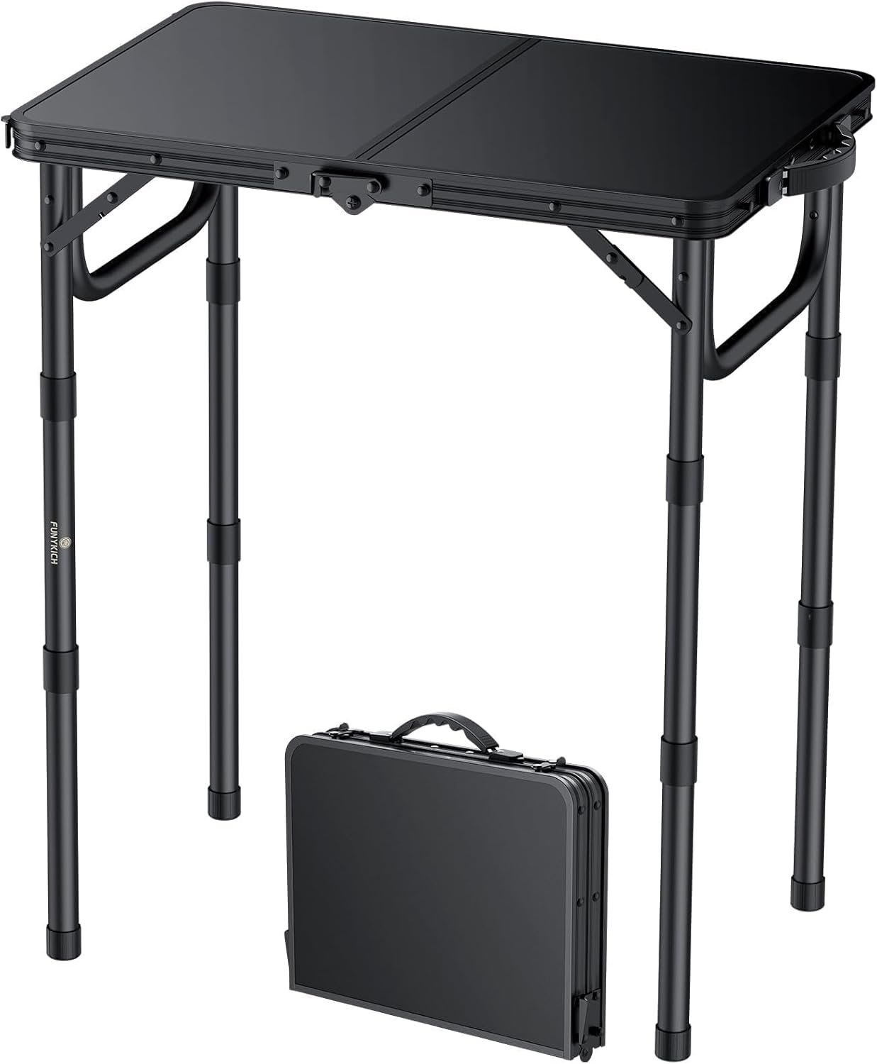 What’s in the box: FUNYKICH 2ft folding table (pre-assembled), carry handle integrated into folded briefcase shape, user card. There’s no separate carry bag included per the product data; check the Amazon listing for updates.