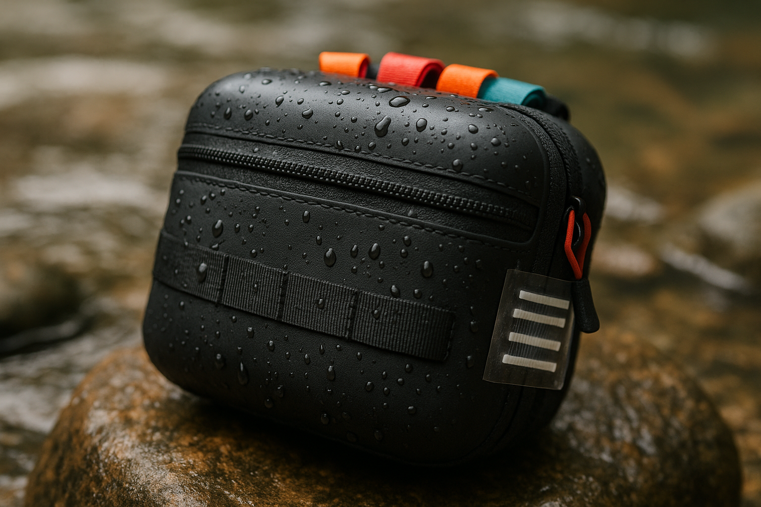 The kit uses an IPX7-rated system — certified for immersion up to 1 meter for 30 minutes — and sealed zippers combined with a rubberized, semi-rigid shell. In realistic scenarios this means protection from kayak capsizes (brief submersion), heavy downpours, and splashes on motorboats.